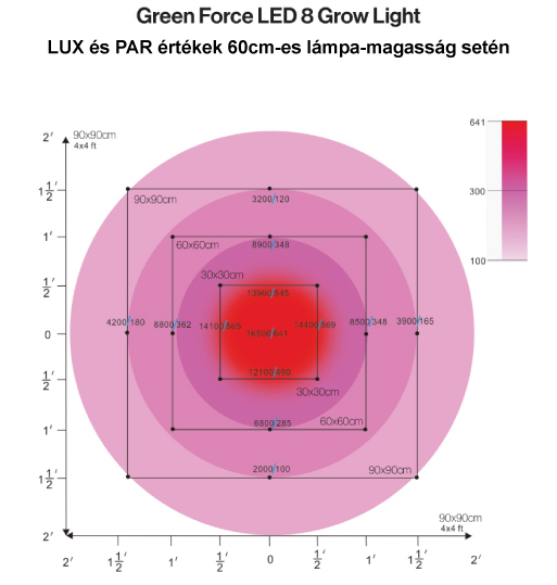 Az intenzitás égőről-égőre változik az adott növényvilágítás technológiájától függően.
